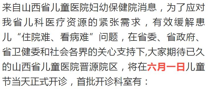 山西省儿童医院晋源院区 六月一日开诊!