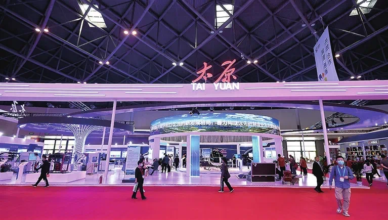蓝色的光柱,不断闪现转型综改等字样,短波红外芯片、快乐驾车载智能终端等产品外绕着光柱,引来众多关注,使得这里成为人气较高的地方。这里是山西综改示范区展示区。