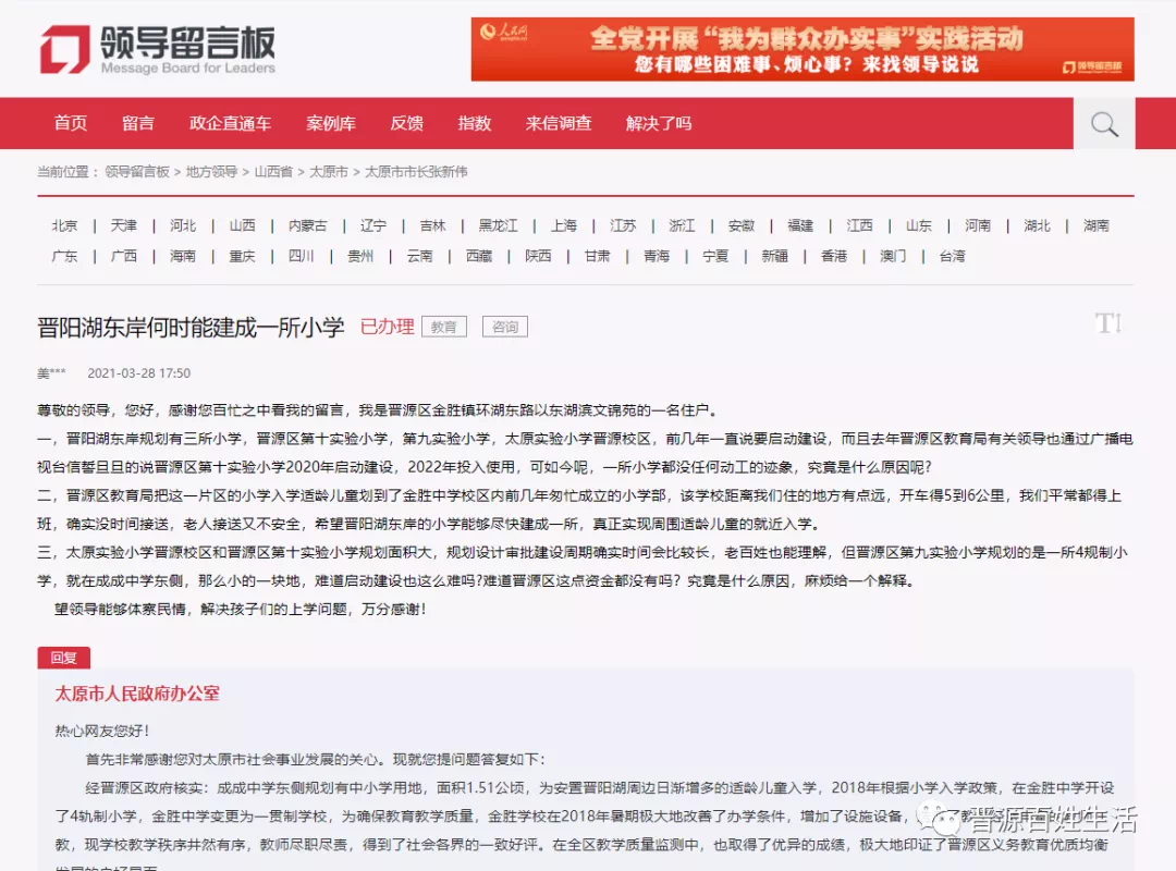 二,晋源区教育局把这一片区的小学入学适龄儿童划到了金胜中学校区内前几年匆忙成立的小学部,该学校距离我们住的地方有点远,开车得5到6公里,我们平常都得上班,确实没时间接送,老人接送又不安全,希望晋阳湖东岸的小学能够尽快建成一所,真正实现周围适龄儿童的就近入学。