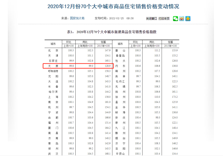 1月15日,国家统计局网站公布了“2020年11月份70个大中城市商品住宅销售价格变动情况”,其中,太原新建商品住宅价格12月份环比下降0.2%,同比下降1.0%;二手房价格环比下降0.1%,同比下降3.1%。